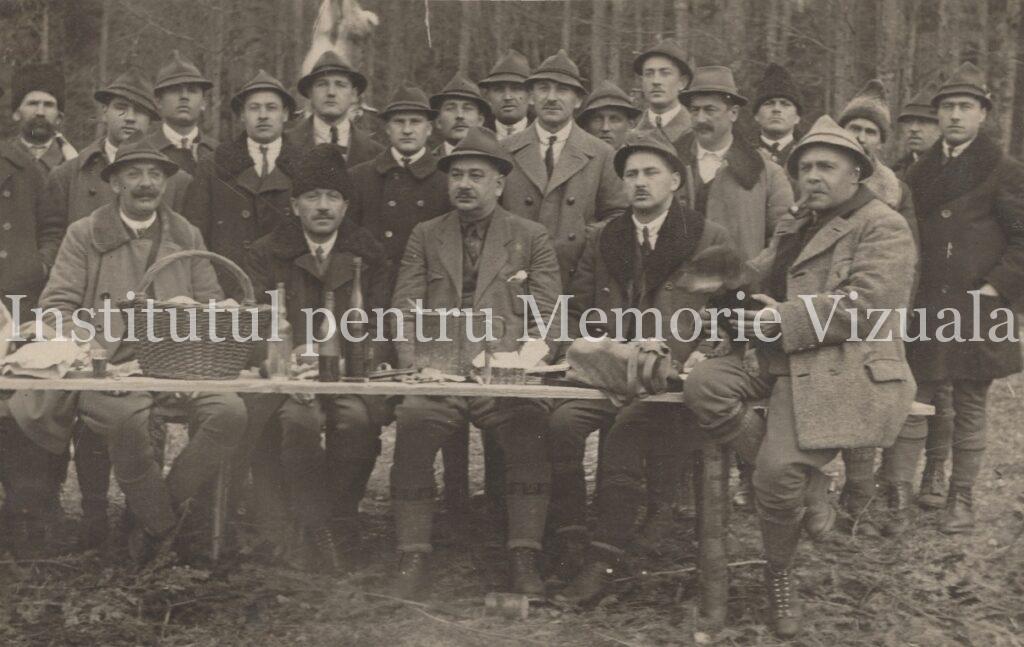 Din categoria faptelor mărunte împărtășesc, alături de dumneavoastră, o fotografie de acum 100 de ani. Câțiva bărbați așezați la masă, sau pe masă, sunt secondați de un grup mare de tineri, îmbrăcați în haine elegante și confortabile. Pe masă, bunătăți. La prima vedere, o clasică ieșire câmpenească a unui grup de prieteni, posibil vânători.