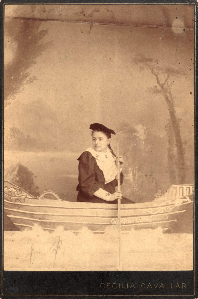 Paradoxal, față de rigidatea și conformismul fotografiilor bucureștene din primii 30 ani de domnie ai lui Carol I, fotografia provincială este mai liberă de constrângeri și mai fantezistă. Aflată mai departe de rigorile rigide impuse de exemplul personal al regelui, fotografii din capitalele județelor țării își dau liber imaginației și inovează. Așa vedem domnișoara marinar de ocazie, cu bereta tradițională pe cap, vâslind din greu pe apele închipuite ale Râului Târgului , în barca de studio fotografiată de Cecilia Cavallar la Câmpulung Muscel. Să nu uităm, la vremea aceea Câmpulung Muscel încă mai era una din stațiunile turistice importante ale României Mici.
