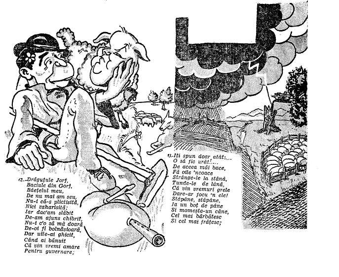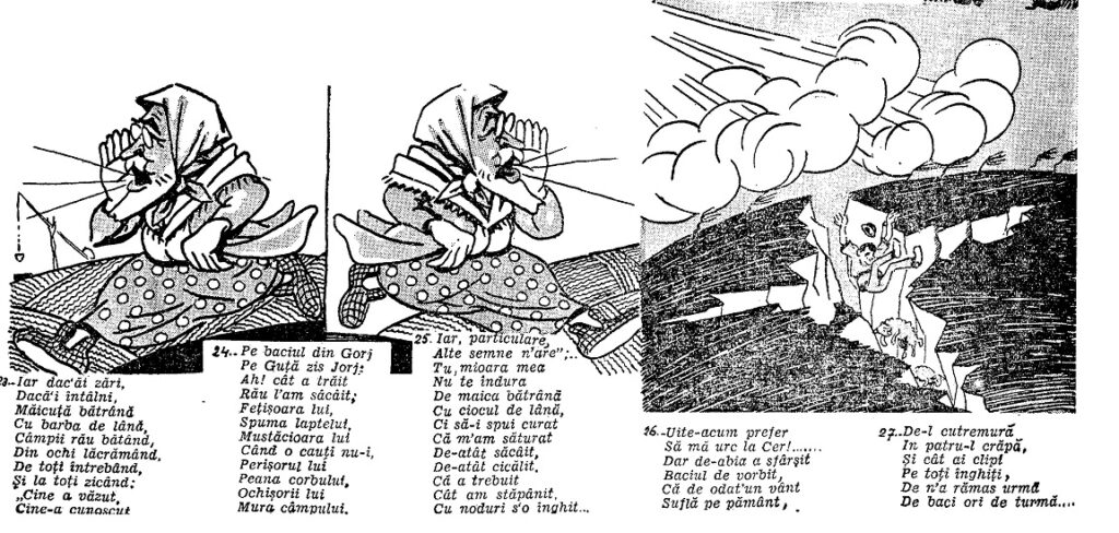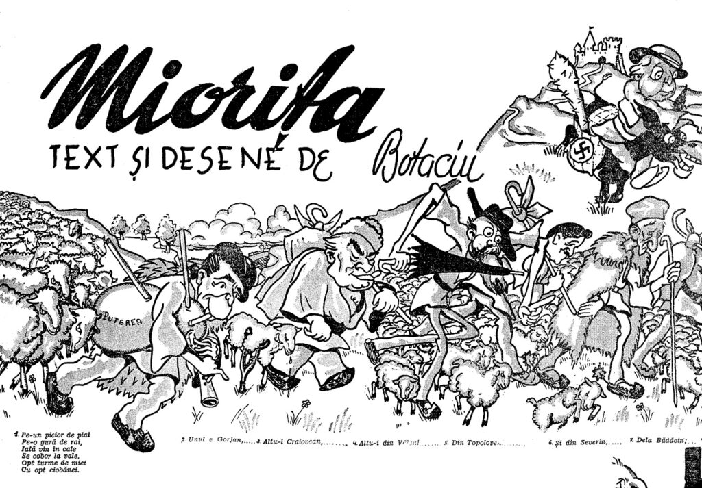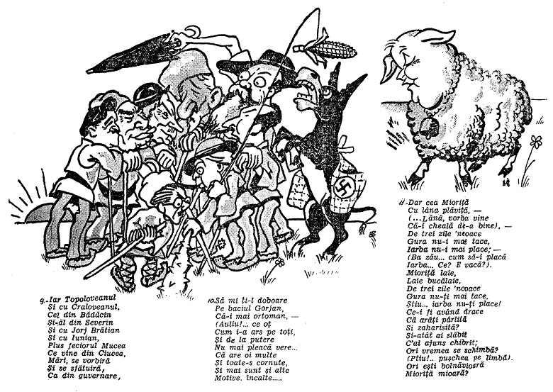 Duminică 30 mai 1937 pagina a treia a Adevĕrului găzduia, sub forma unei parodii a Mioriței (deci cu un orizont referențial constând în cvasitotalitatea absolvenților a măcar două clase primare), o bandă desenată politică a acestuia, având 11 cadre și 27 de texte ce le însoțeau.