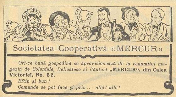 Reclama avea și o parte vizuală, realizată de vreunul din tinerii graficieni colaboratori ai revistei, și îndemna onorabilele gospodine să se aprovizioneze de la renumitul magazin de coloniale, delicatese și băuturi (mereu băuturile…) din Calea Victoriei no. 52. Comenzile telefonice acceptate!