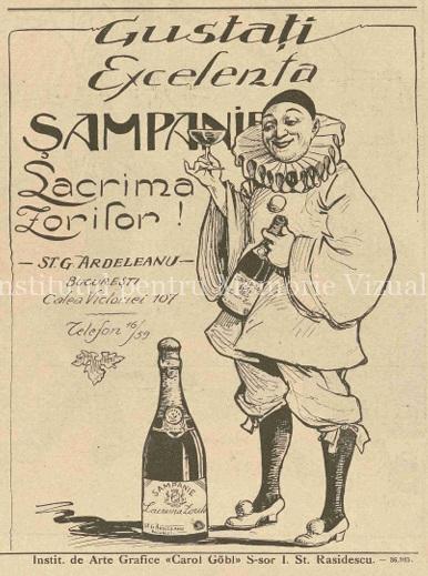 Reclama de bază, alb negru, din aprilie 1913, și reluată ulterior de mai multe ori, înfățișează un actor de teatru, în costum de arlechin, poate chiar maestrul Iancu Brezeanu, cunoscut pentru apetența sa față de băutura de bună calitate, cu o sticlă și un pahar plin în mâini, și cu o uriașă filoă de șampanie în față. Textul îndeamnă cititorii revistei să se bucure de binefacerile licorii: Gustați Excelenta Șampanie Lacrima Zorilor!