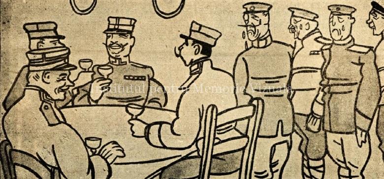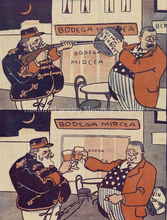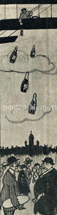 Bucureștenii trebuiau încurajați, deoarece înfrângerile militare constituiau un motiv serios de îngrijorare. Așa că același Șirato publică, în numărul 5 din aceeași lună, o nouă caricatură reclamă, în care militarii români stau la masă și benchetuiesc, veseli, cu paharele pline de șampanie, în timp ce prizonierii nemți se uită și își plâng dubla condiție infamă: de învinși militari și de lipsă a delicioasei șampanii!