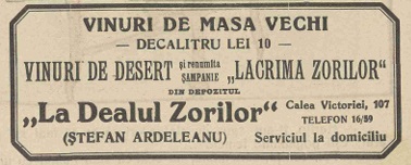 Persoana amintită în scurta povestire nu este altul decât Ștefan Ardeleanu, proprietar al depozitului La Dealul Zorilor, de pe Calea Victoriei nr. 107, telefon 16/59, unde acesta desfăcea atât vinuri de masă la prețuri populare, sub marca Dealul Zorilor, cât și, mai nou, șampania Lacrima Zorilor. Lacrimă prezumată, pare-se, șă îi țină pe petrecăreți până la prima rază de soare a dimineții…