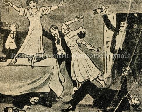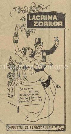 O altă reclamă alb negru, însoțită de un cuplet, apare în martie 1916, numărul 28 din anul XII, și ne înfățișează un cuplu de bon viveuri, tânărul bărbat în costum, cu monoclu și joben ținându-și de șold partenera și, cu cealaltă mână, paharul de șampanie, în timp ce demoazela, cu mâneci suflecate și decolteu generos, ridică simetric sticla de Lacrima Zorilor, proaspăt deschisă. Versurile țin să ne informeze că
